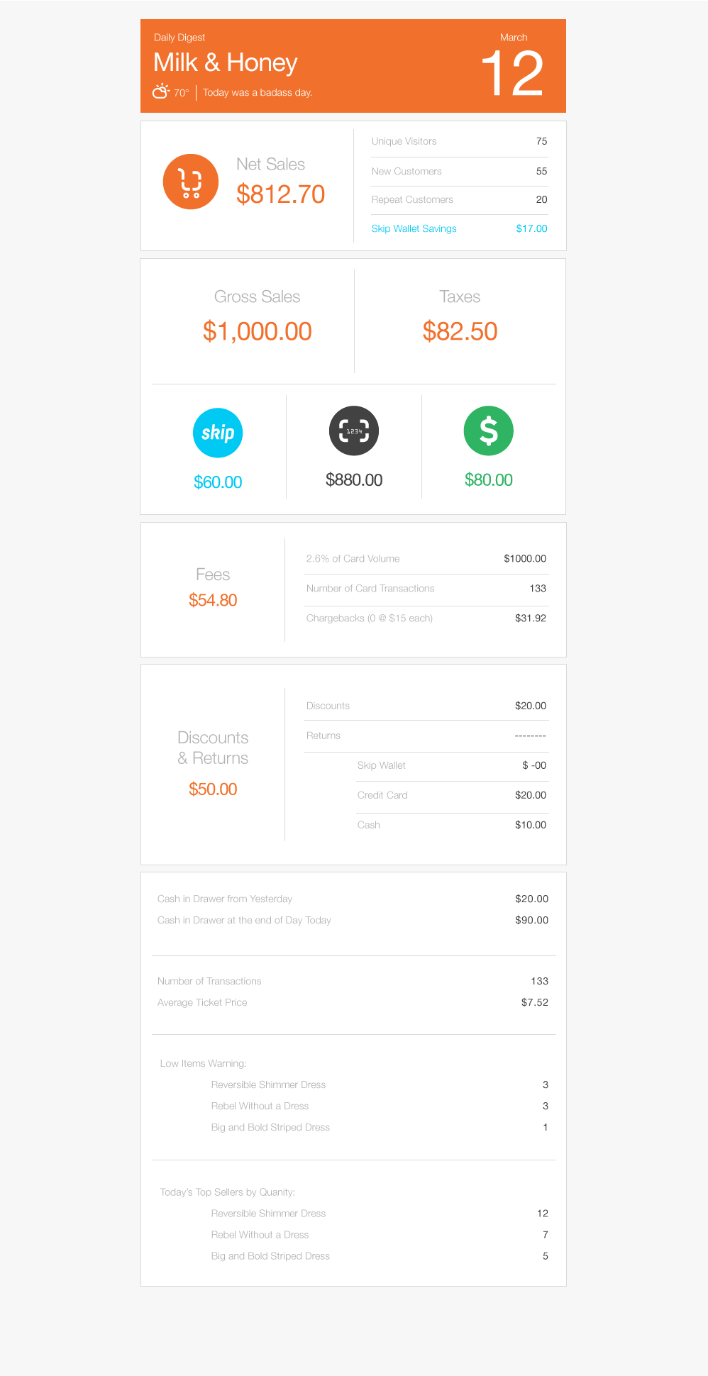 Dashboard Concept for merchant showing daily sales.