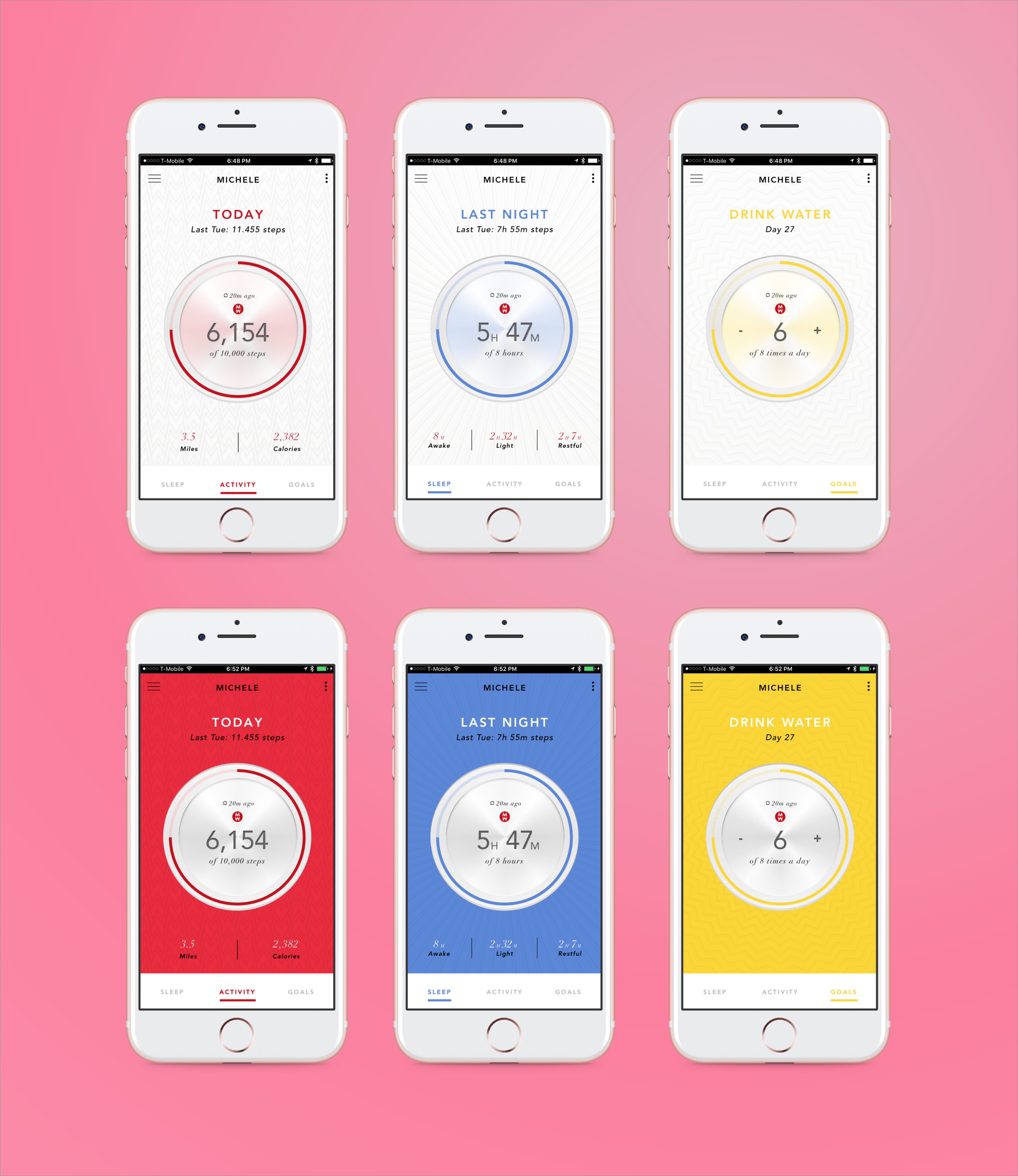 Activity, sleep and goal tracker screen for luxury woman’s brand watch Michele.