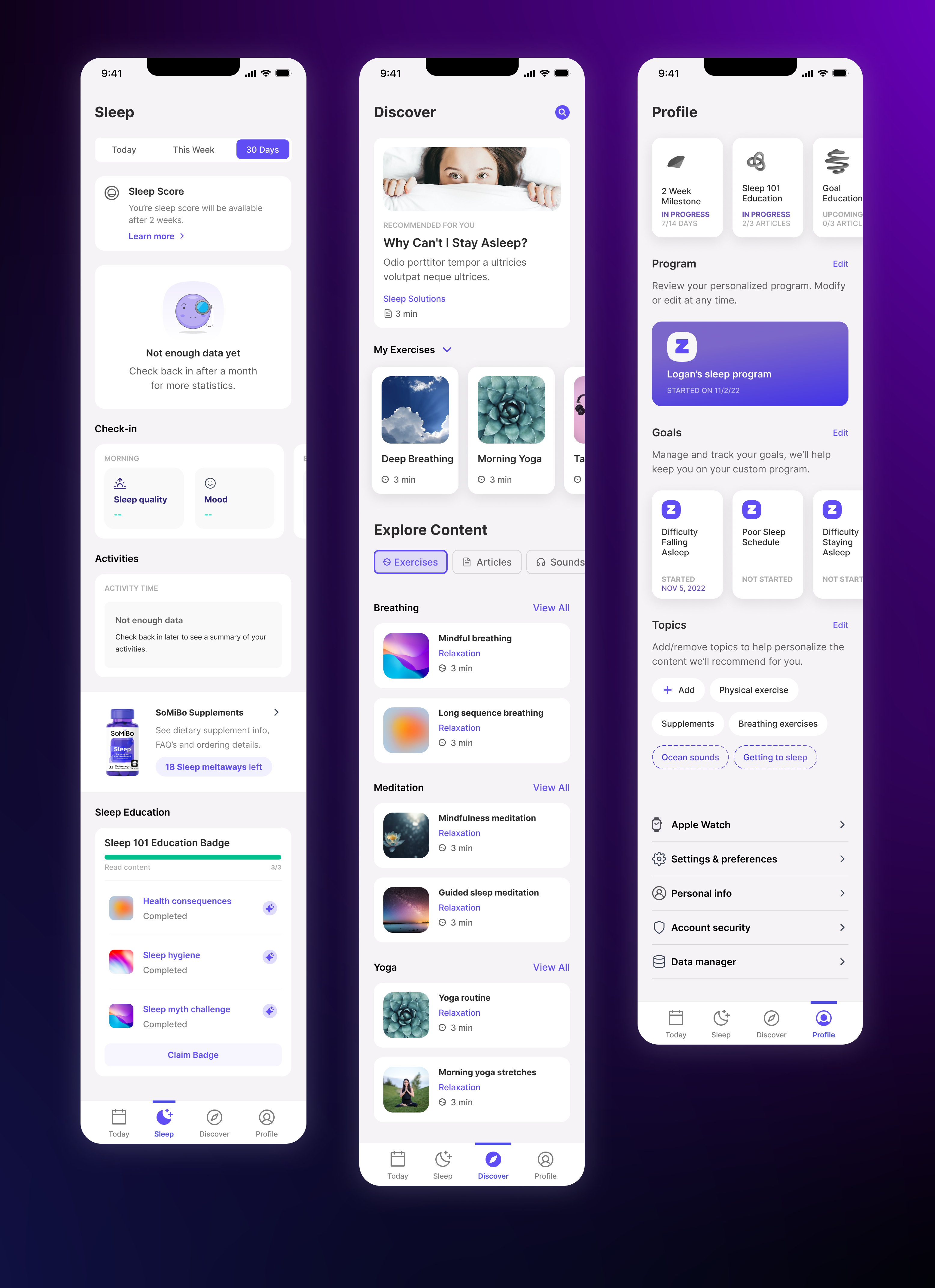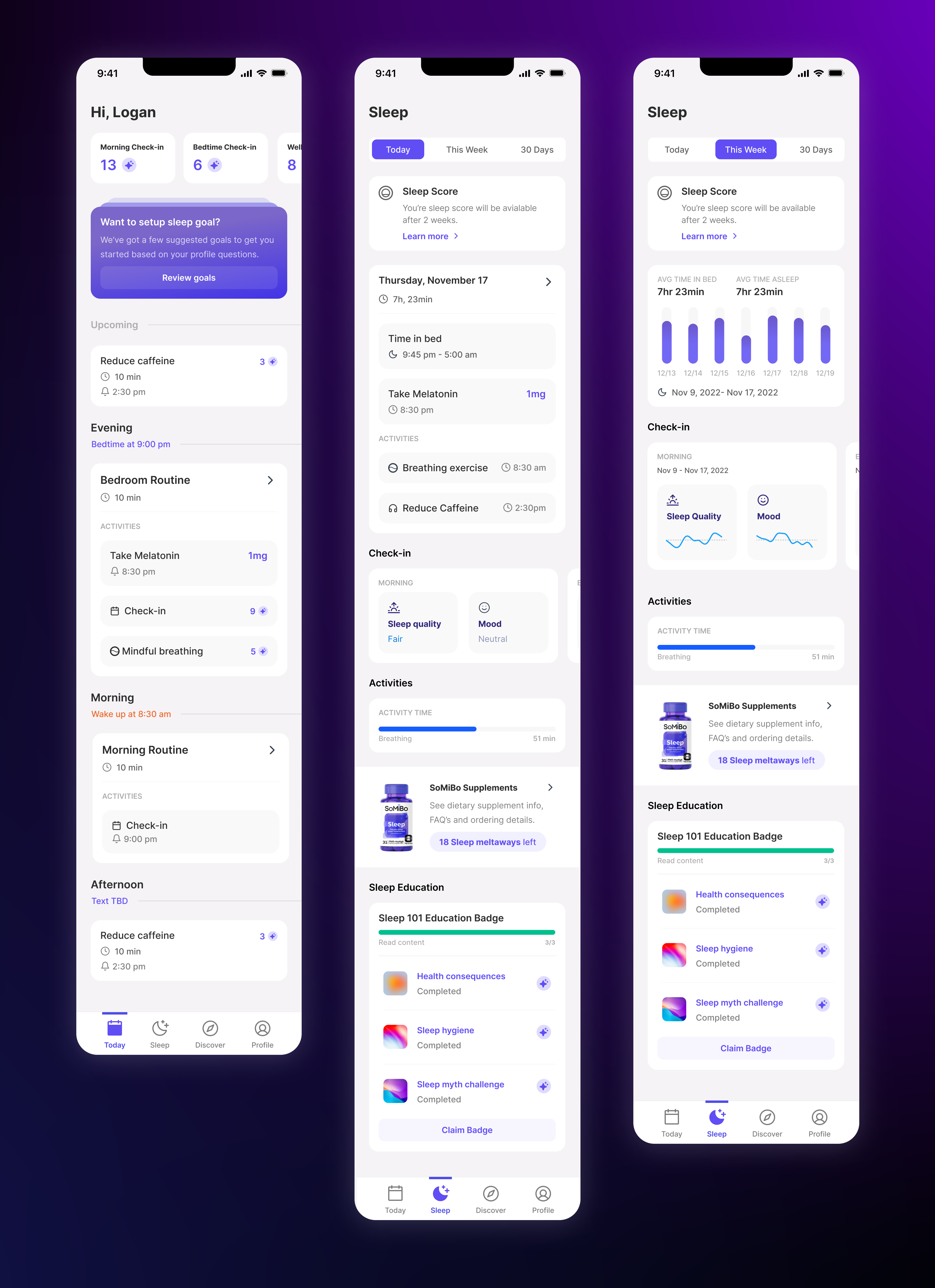 An app for a sleep supplement with: